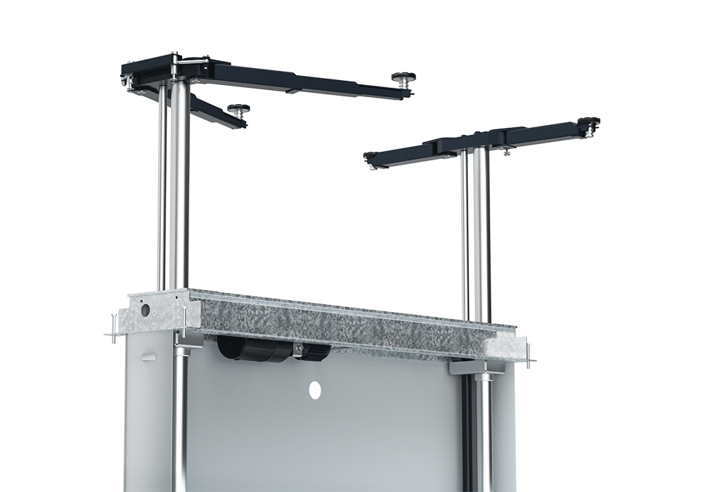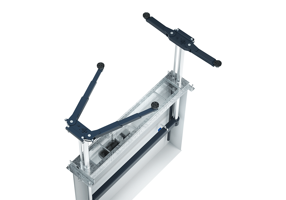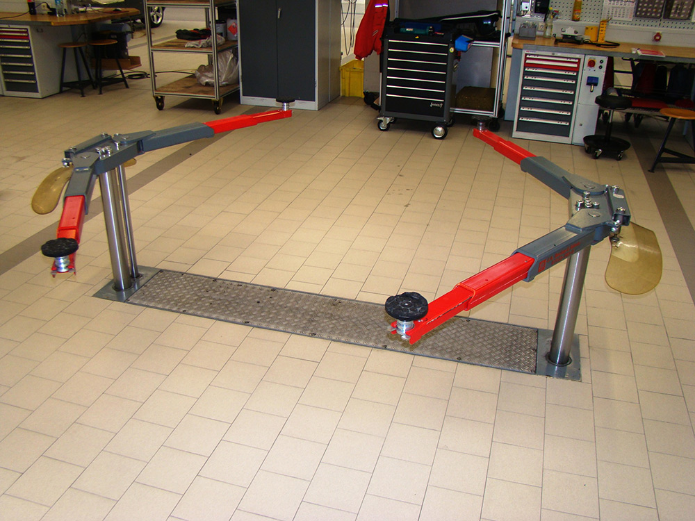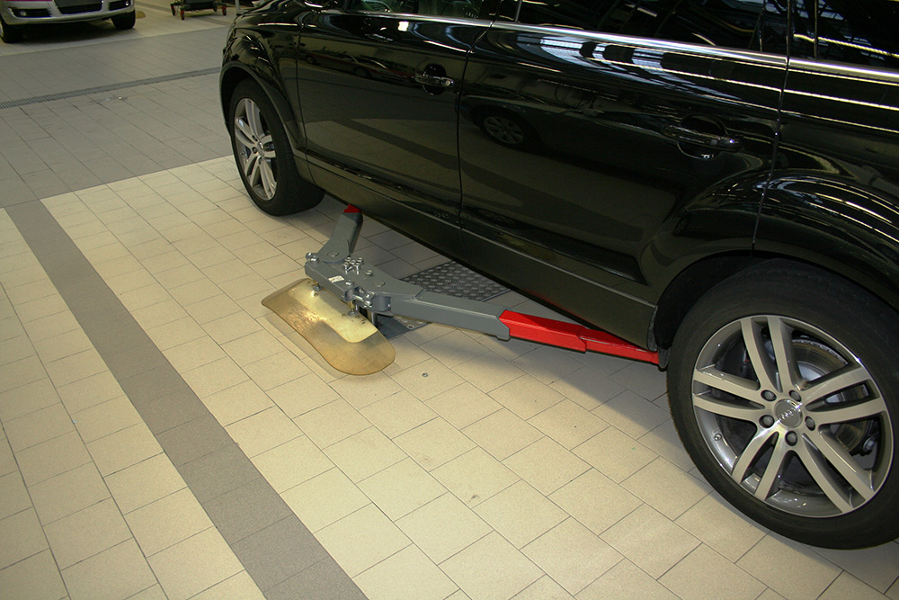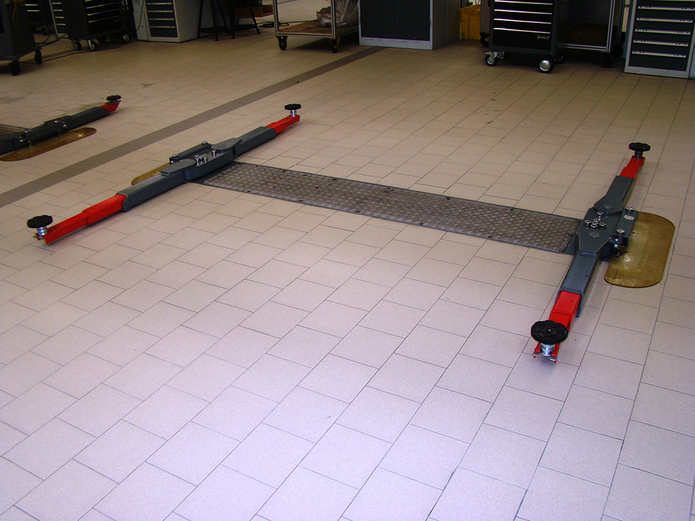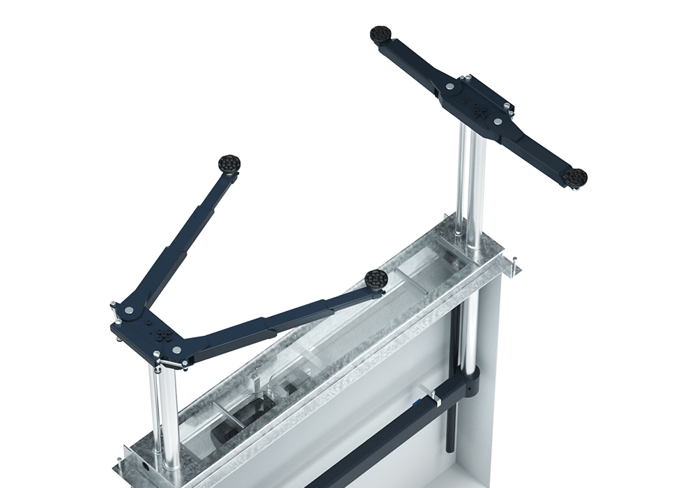 The TwinRam 35 S2/2300 is a recessed lift featuring double telescopic tilting arms and height-adjustable pick-up plates. This configuration allows the vehicle to be positioned as close to the floor as possible when not in use (98 mm lowest height), while allowing flexible positioning to the pick-up points during lifting.