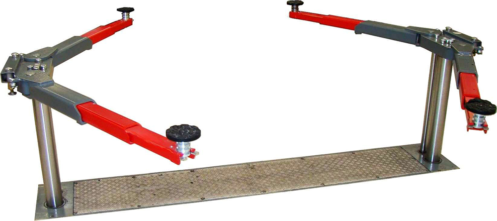 The height-adjustable support plates (pick-up plates) ensure that the vehicle's lifting points align precisely with the chassis, regardless of the vehicle's ground clearance. This feature is essential for safe lifting and avoiding damage.